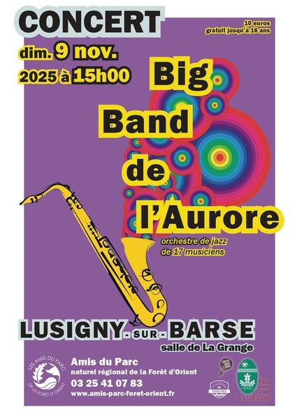 Ne manquez pas le concert du Big Band de l’Aurore, orchestre de jazz de 17 musiciens, proposé par l’association des Amis du Parc naturel régional de la Forêt d’Orient à Lusigny-sur-Barse le 9 novembre 2025.